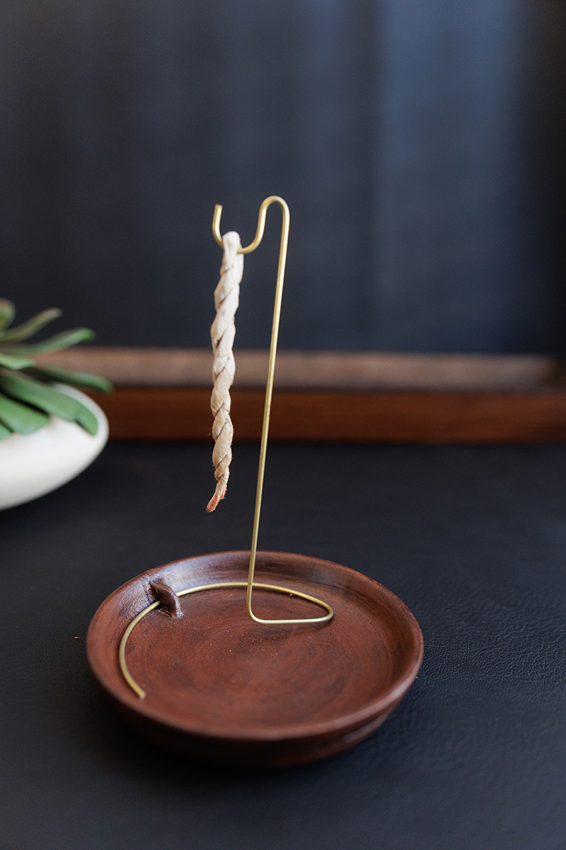 Featuring a bowl-like shape with an integrated wire, the burner securely holds rope incense, making it a functional tool for meditation and ritual use. The wire not only ensures stability but also adds to the burner’s aesthetic charm, blending seamlessly with its raw brown clay finish.